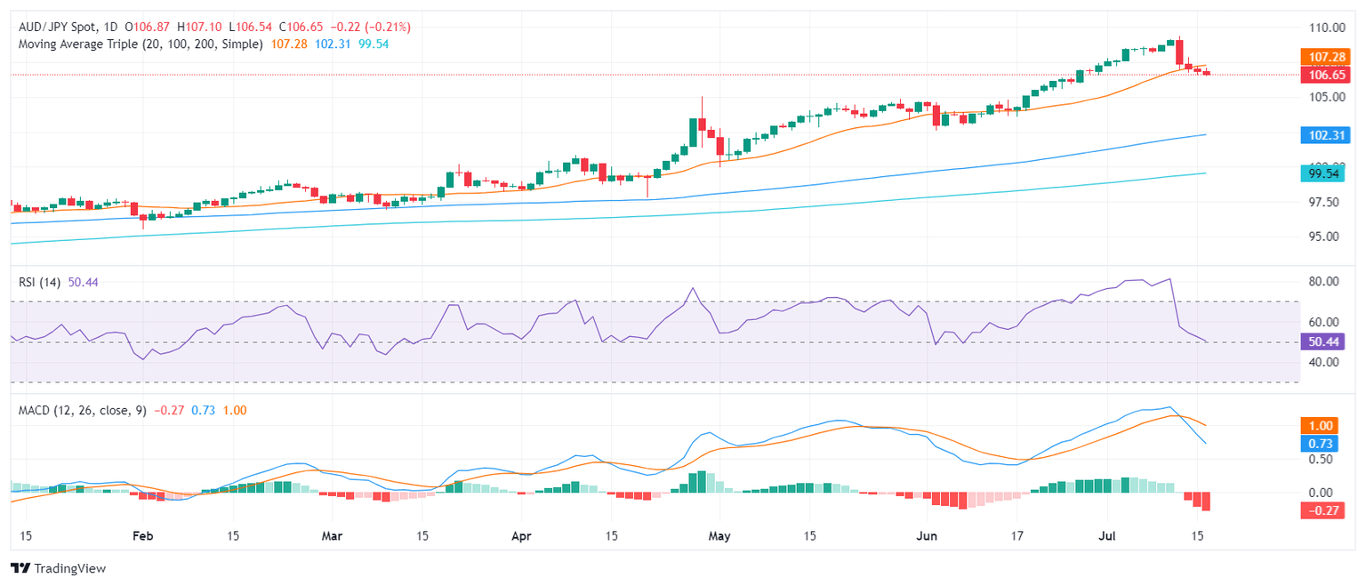 El RSI diario para el par AUD/JPY ahora se sitúa en 51, mientras que el MACD diario presenta barras rojas planas, lo que implica que la actividad de venta está disminuyendo.