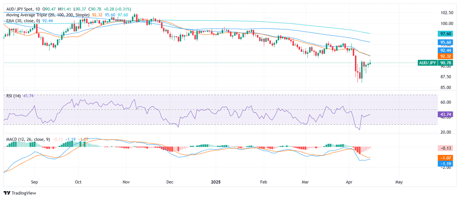 El par AUD/JPY avanzó el martes, subiendo hacia el extremo superior de su rango diario y rondando cerca del área 90.90 antes de la sesión asiática. El cruce registró modestos avances intradía, aunque la estructura técnica más amplia aún apunta hacia el sur, ya que las medias móviles y las señales de tendencia mantienen una postura bajista.