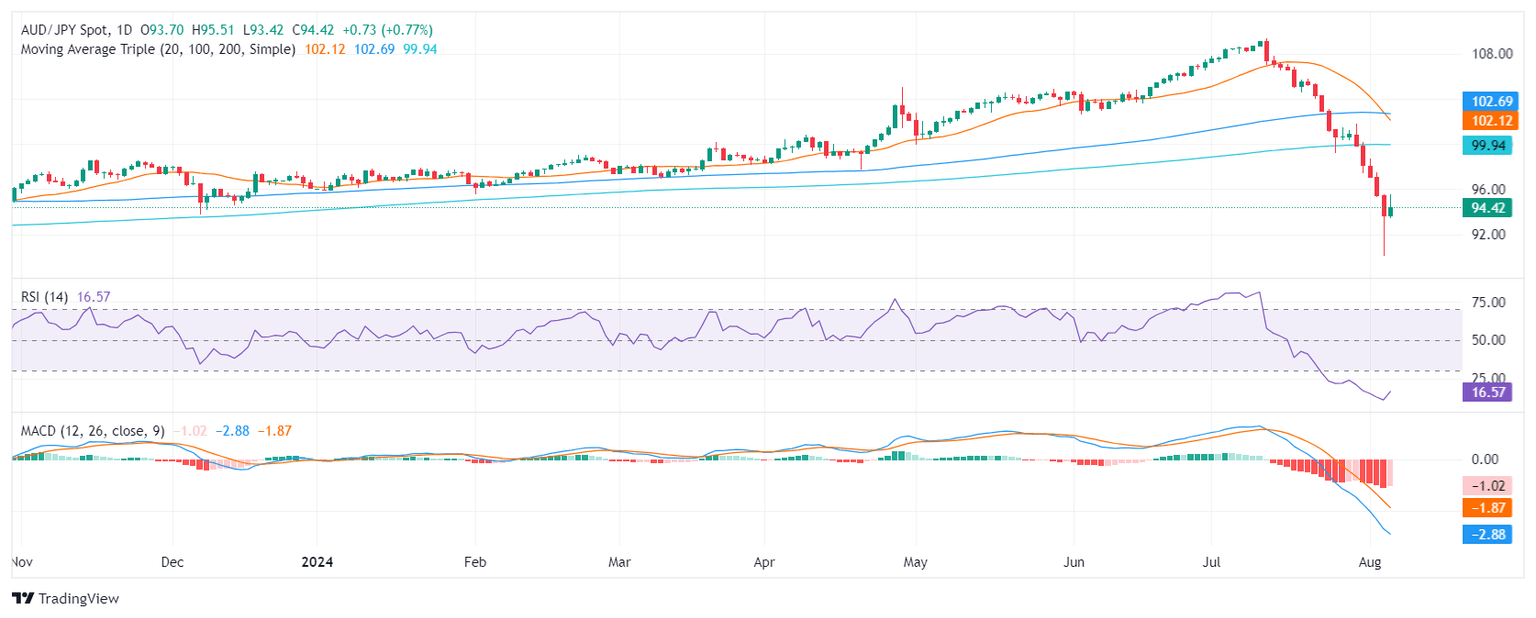 En la sesión del martes, el par AUD/JPY subió un 1.20% hasta 94.70, recuperando algunas de las pérdidas vistas en las sesiones anteriores. Sin embargo, el par parece haber entrado en un período de consolidación, y los bajistas siguen en control.