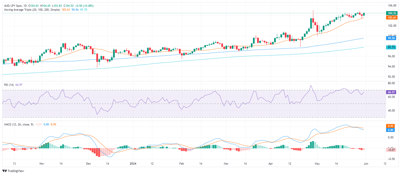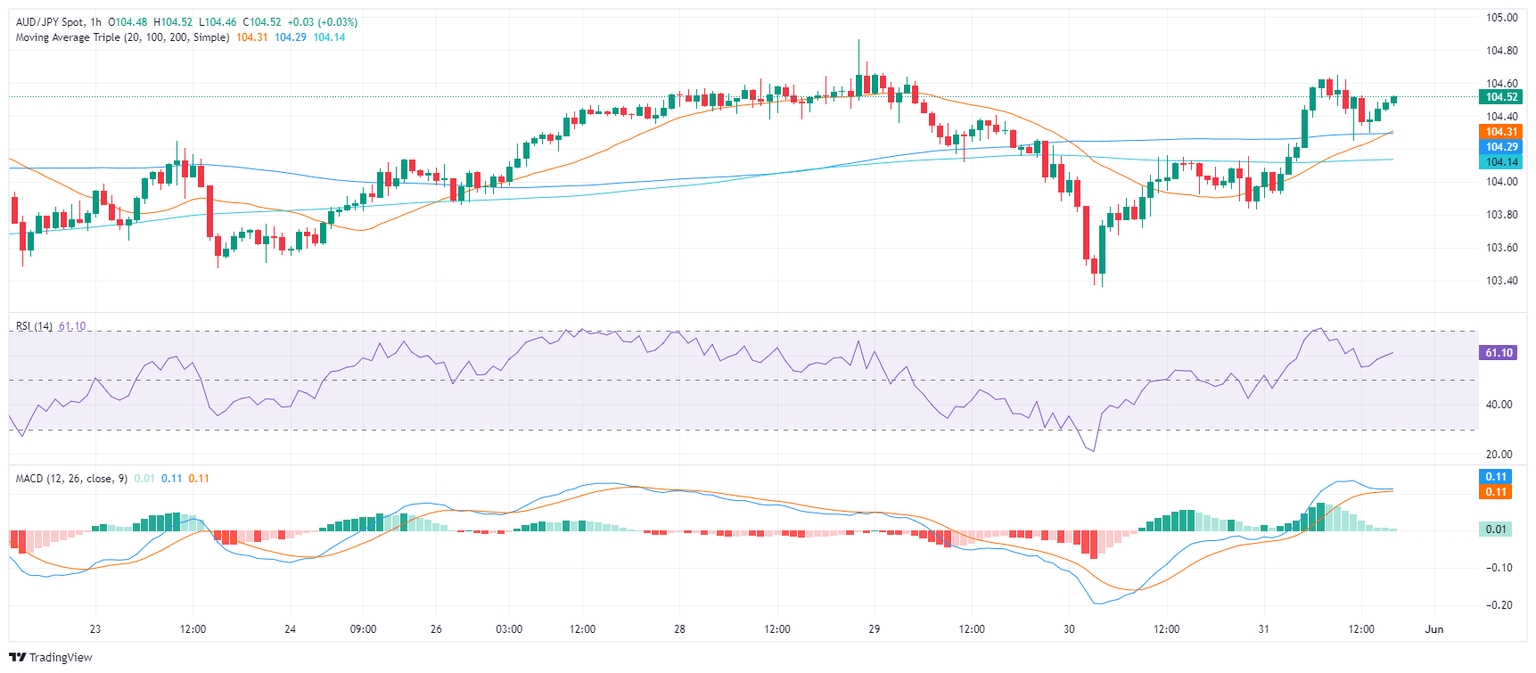 En la sesión de negociación del viernes, el par AUD/JPY se disparó a la región de 104.50 debido al impulso positivo, reforzando las expectativas de un panorama general alcista. Sin embargo, la trayectoria ascendente del mercado muestra signos de fatiga, y el par ha entrado en una fase de consolidación.