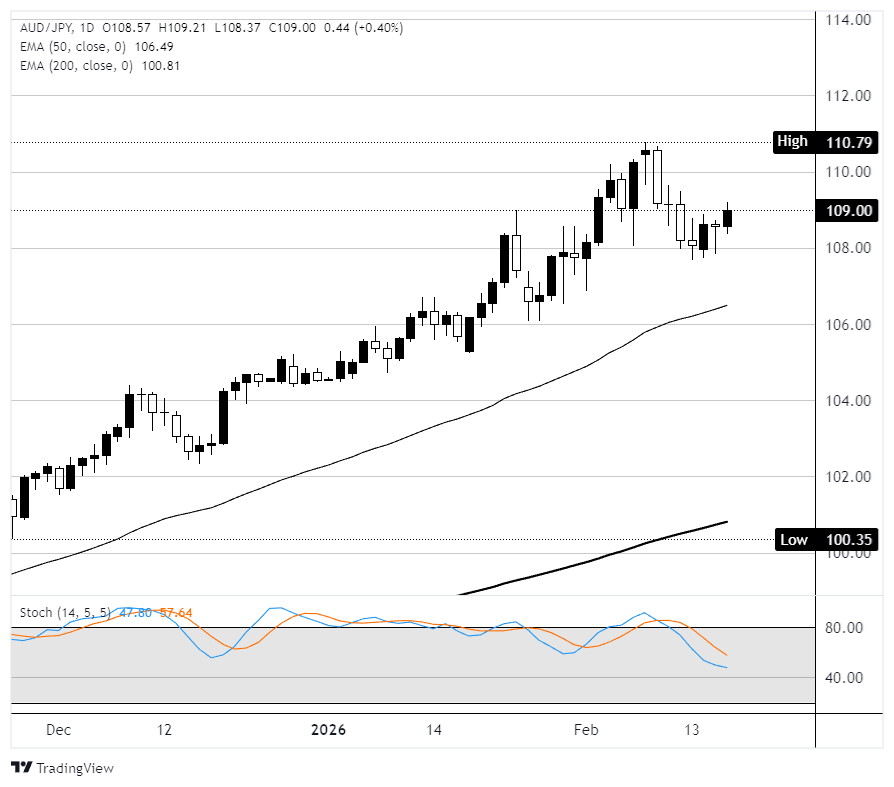 El AUD/JPY se fortaleció modestamente el miércoles, subiendo alrededor del 0.4% a medida que la postura de línea dura del Banco de la Reserva de Australia (RBA) continúa respaldando el lado del Dólar australiano (AUD) del par. Las minutas del RBA publicadas a principios de esta semana señalaron que los riesgos de inflación han aumentado y que la Junta está preparada para actuar nuevamente, en contraste con el camino de normalización más gradual del Banco de Japón (BoJ) desde el 0.75%. El Producto Interno Bruto (PIB) del cuarto trimestre de Japón llegó por debajo de las expectativas en un 0.1% intertrimestral a principios de esta semana, aunque esto no ha descarrilado las expectativas del mercado para una subida del BoJ en abril. El jueves trae un riesgo clave de doble evento: los datos de empleo de Australia de enero al inicio de la sesión, seguidos de las cifras de inflación del Índice Nacional de Precios al Consumidor (IPC) de Japón para enero más tarde en el día de negociación, donde cualquier sorpresa al alza en la inflación subyacente podría reforzar las apuestas de endurecimiento del BoJ y pesar sobre el par.