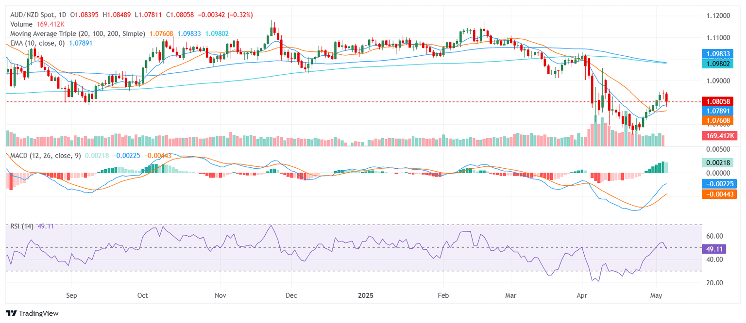El par AUD/NZD cayó el martes, cotizando cerca de la zona de 1.0800 tras un descenso constante durante la sesión europea. La acción del precio se mantuvo confinada dentro del rango del día, pero la deriva a la baja resalta el tono bajista subyacente a medida que el par se acerca a la sesión asiática. A pesar de algunas señales de impulso mixtas, la presión dominante parece provenir de los indicadores de tendencia más amplios.