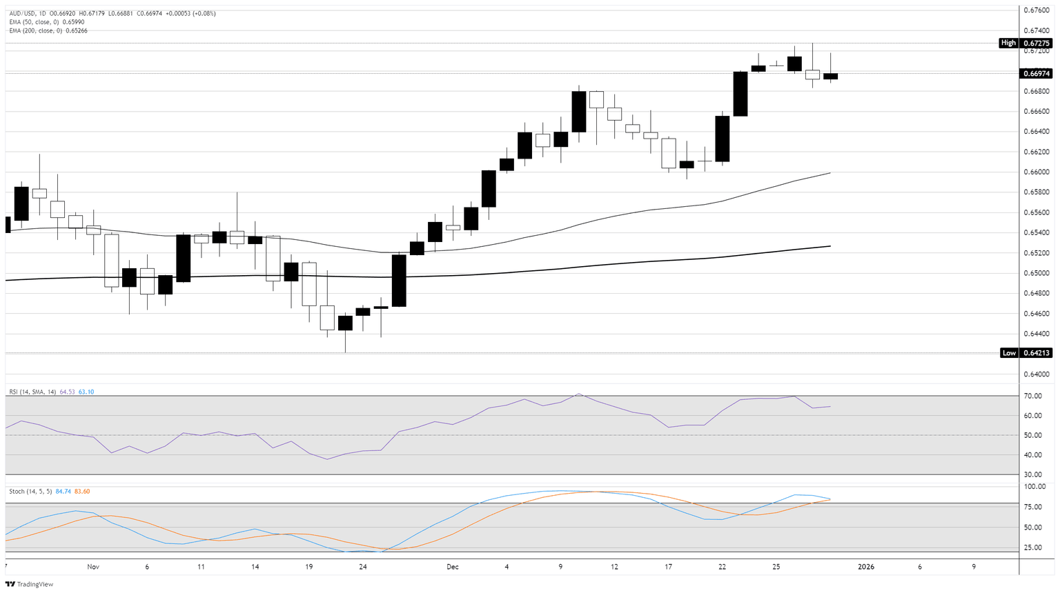 AUD/USD se mantuvo en el nivel de 0.6700 por segundo día consecutivo mientras el par Dólar australiano lucha con los volúmenes de mercado de fin de año que restringen el impulso general. El Dólar australiano mira hacia arriba a medida que el Banco de la Reserva de Australia (RBA) se acerca a un nuevo ciclo de subida de tasas, con el Dólar estadounidense (USD) bajo presión en todos los frentes debido a una Reserva Federal (Fed) moderada que se prepara para más recortes de tasas hasta 2026.