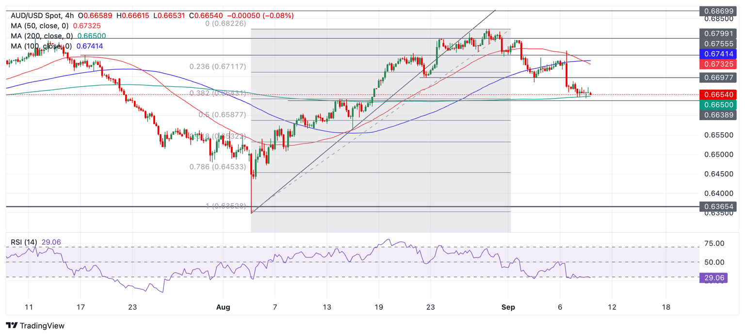 El AUD/USD ha alcanzado el siguiente objetivo bajista en 0.6645 y está encontrando soporte en la media móvil simple (SMA) de 200 periodos. Si puede cerrar por debajo de la SMA de 200 y 0.6645, indicará que la tendencia bajista probablemente continuará, con el siguiente objetivo en 0.6587, el nivel de retroceso de Fibonacci del 0.50 del rally de agosto.