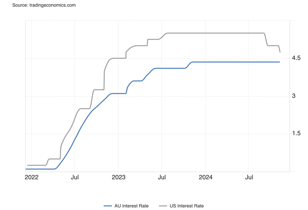 La tendencia bajista del AUD/USD desde principios de octubre se ha debido a un cambio radical en las expectativas del mercado sobre la trayectoria de las tasas de interés en EE.UU. Antes de octubre, estas habían sido para que la Fed bajara las tasas de interés agresivamente, pero los sólidos datos económicos de EE.UU. llevaron a una revisión de estas expectativas. El resultado de las elecciones presidenciales de EE.UU. fue otro factor que apoyó al par.