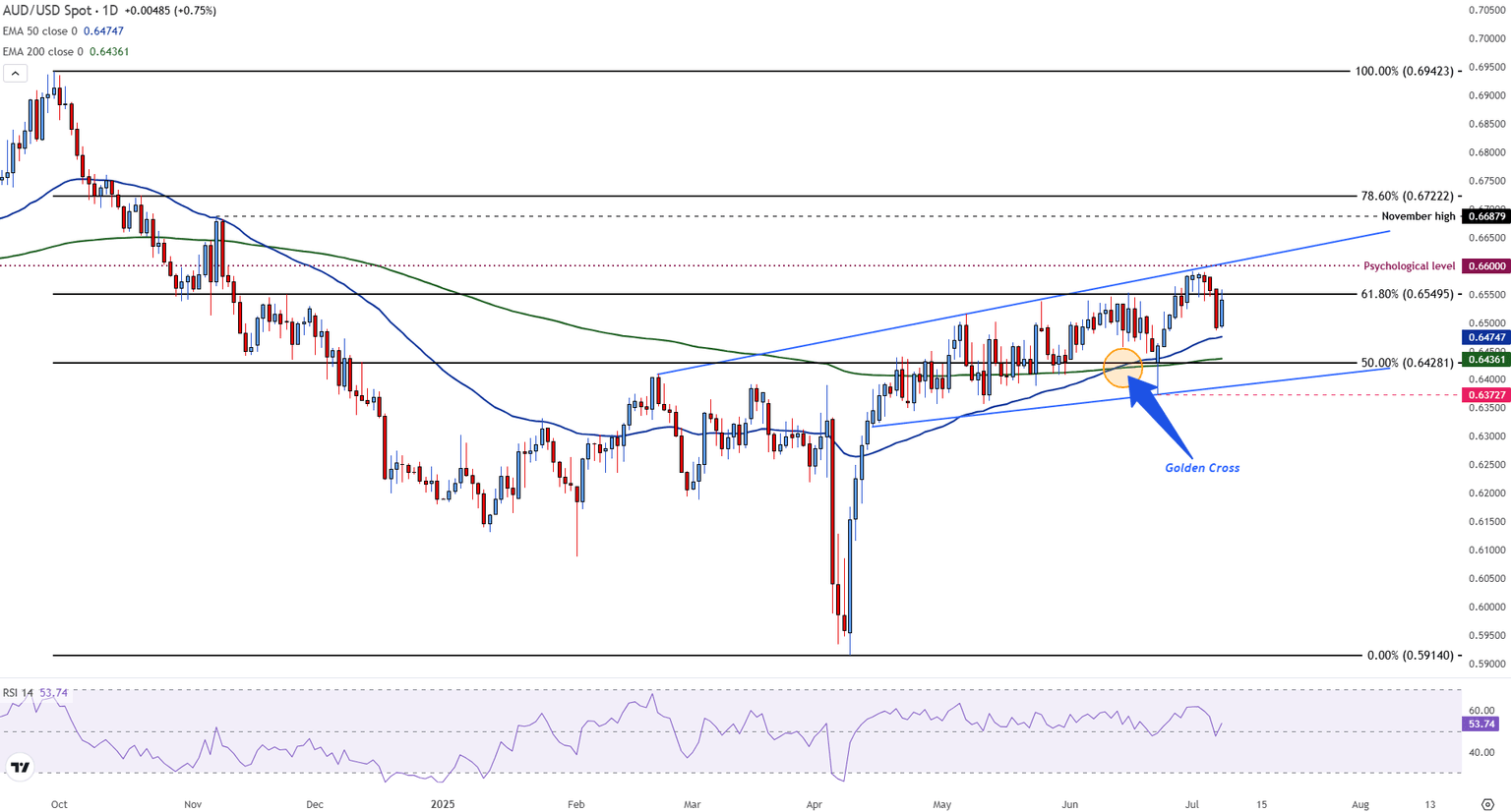 - El AUD/USD apunta a la resistencia de 0.6550 mientras el cruce dorado apoya la tendencia alcista más amplia.