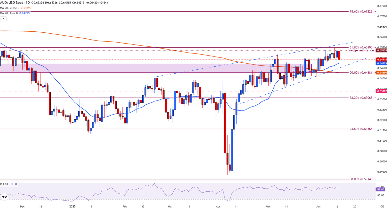 El patrón refleja un desvanecimiento del impulso alcista y el riesgo de una ruptura si los niveles de soporte no se mantienen. El soporte inmediato se encuentra en la media móvil simple (SMA) de 20 días cerca de 0.6473, mientras que un soporte más fuerte se alinea con la SMA de 200 días y el nivel de Fibonacci del 50% en 0.6428.
