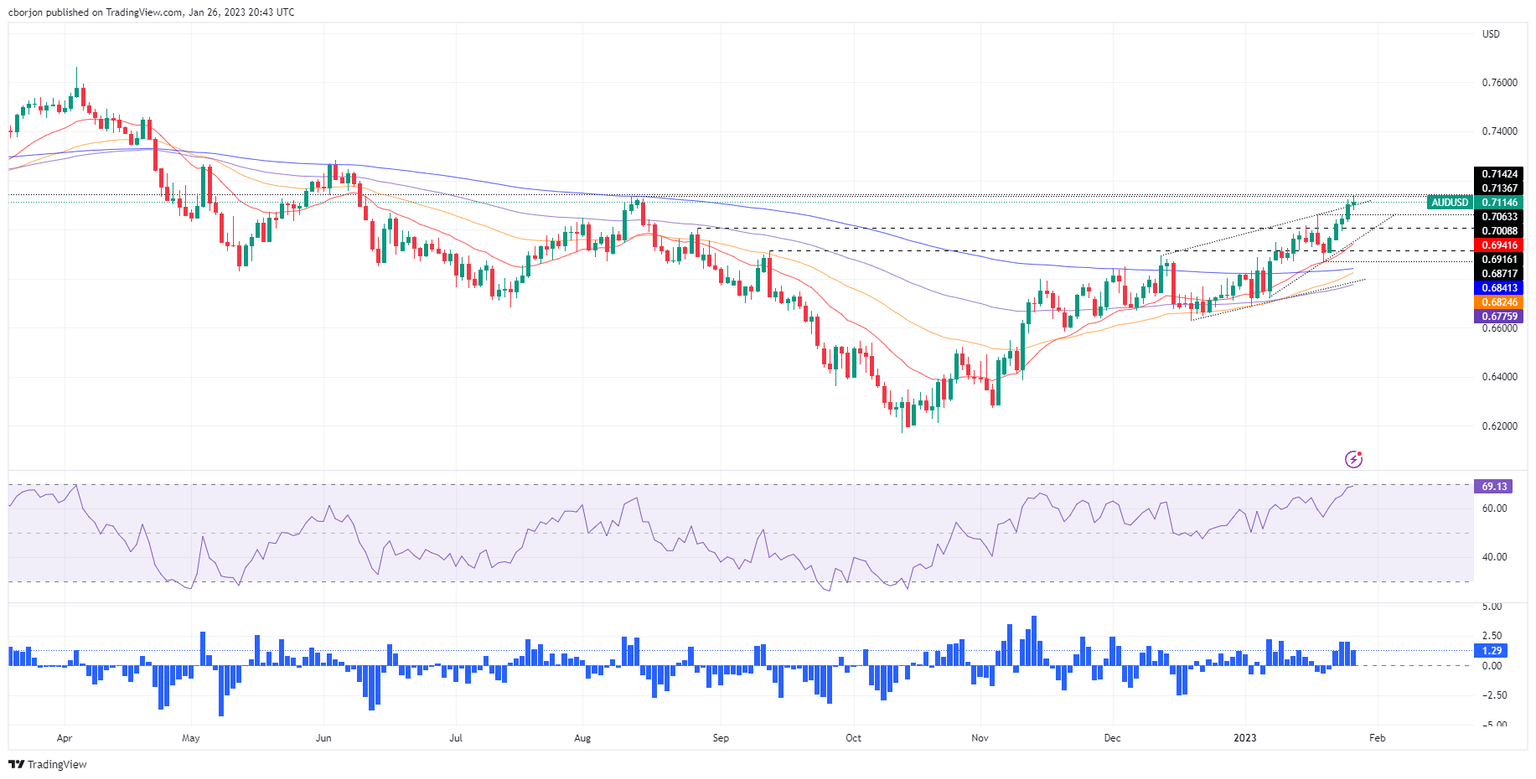 Por lo tanto, el AUD/USD podría continuar su tendencia alcista, aunque recortando parte de sus ganancias. Alcanzar un cierre diario por encima de 0.7100 exacerbó un movimiento alcista hacia un nuevo máximo de 7 meses, manteniendo a los alcistas con la esperanza de probar 0.7200. Sin embargo, en su camino hacia el norte, el AUD/USD necesita superar 0.7142, seguido de 0.7150, y luego el nivel psicológico clave 0.7200.