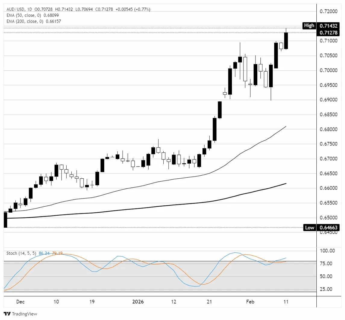 Por el lado australiano, el Banco de la Reserva de Australia (RBA) aumentó su tasa de efectivo en 25 puntos básicos a 3.85% el 3 de febrero, el primer aumento desde finales de 2023, después de que la inflación se reanudara en la segunda mitad de 2025. El Vicegobernador del RBA, Andrew Hauser, reforzó una inclinación hacia el endurecimiento el miércoles, advirtiendo que la inflación es demasiado alta y que son posibles más aumentos. El jueves se publicarán las expectativas de inflación de los consumidores australianos para febrero, lo que podría respaldar la narrativa de línea dura del RBA. El evento principal de la semana es el Índice de Precios al Consumidor (CPI) de EE.UU. para enero, con una inflación general interanual esperada en 2.5% (bajando desde 2.7%) y el CPI subyacente intermensual pronosticado en 0.3%. Un informe más suave erosionaría aún más el soporte del Dólar estadounidense, mientras que una lectura alta podría frenar el rally del par. Los oradores de la Reserva Federal (Fed), Hammack y Miran, también hicieron comentarios el miércoles, con Miran calificado de moderado en 3.6 frente a un promedio de 4.0; la Fed's Logan y Miran hablarán nuevamente el viernes.