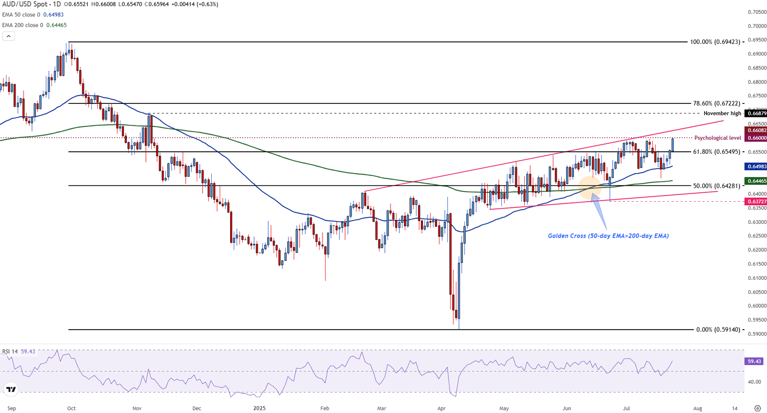 - Los alcistas del AUD/USD prueban la resistencia clave en 0.6600 mientras el precio se mantiene dentro de los límites de un canal ascendente.