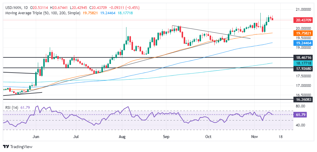 El USD/MXN se disparó hacia 20.55, antes de marcar nuevos mínimos diarios por debajo de 20.45. A pesar de esto, el sesgo del par exótico está inclinado al alza, a menos que los vendedores empujen el tipo de cambio por debajo de 20.00, antes de probar la media móvil simple (SMA) de 50 días en 19.74. Al alza, los compradores tenían un camino claro para probar los máximos del año hasta la fecha (YTD) en 20.80, si recuperan 20.50.