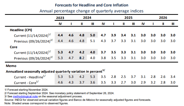 Banxico actualizó sus previsiones para 2024, 2025 y 2025. La junta proyecta que la inflación general convergerá al objetivo del 3% del banco en el cuarto trimestre de 2025.