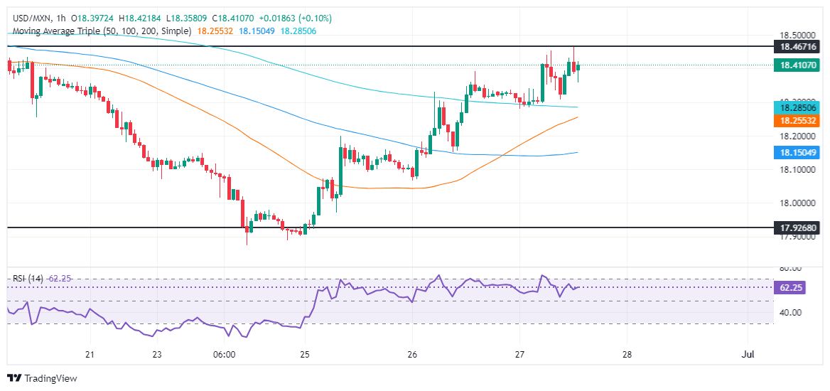 El USD/MXN retrocedió a 18.35, antes de reanudar su tendencia alcista, con el momentum favoreciendo a los compradores, como lo muestra el RSI en el gráfico horario. El par USD/MXN cotiza con ganancias del 0.42%.