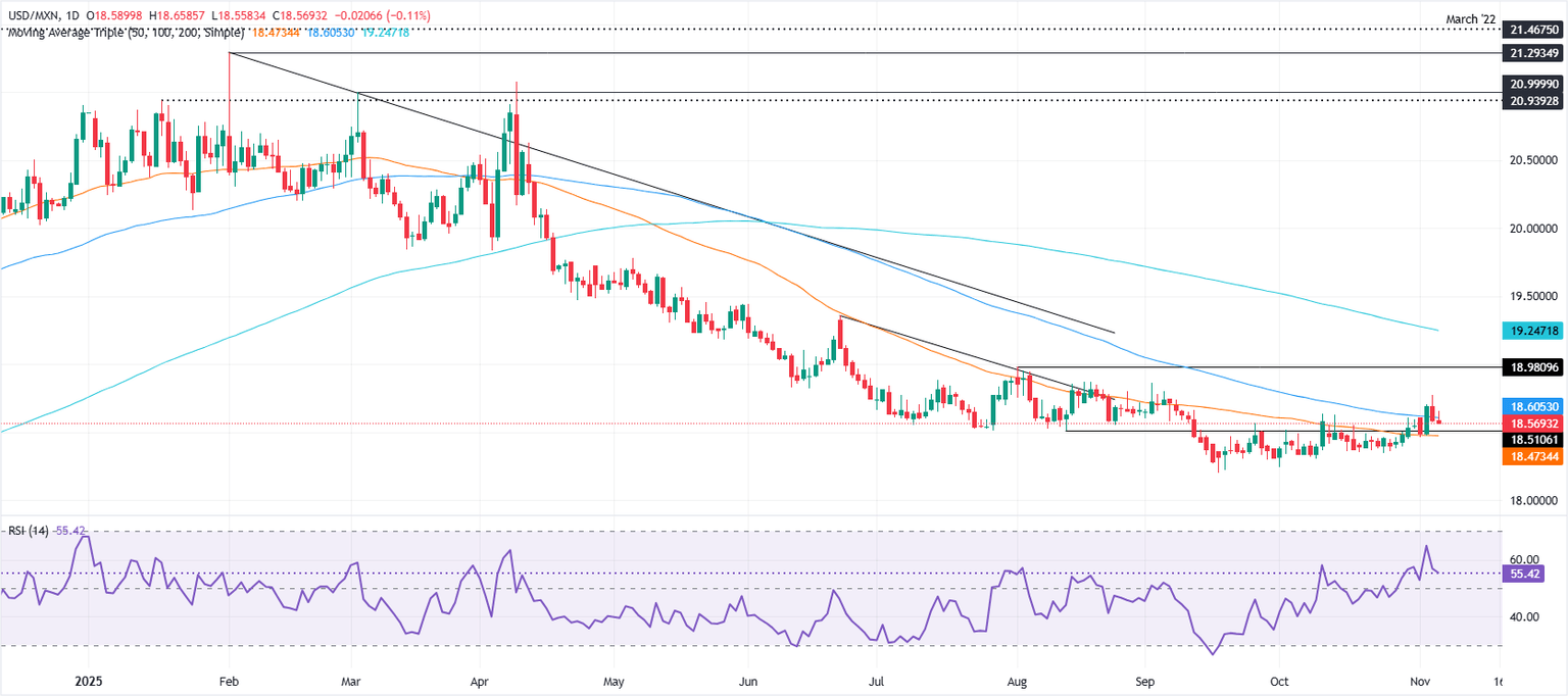 Tras la decisión, el USD/MXN cayó de alrededor de 18.59 a 18.57, pero sigue sin probar el mínimo diario de 18.55. Una ruptura de este último podría exponer la confluencia de las medias móviles simples (SMA) de 20 y 50 días en torno a 18.46/48, antes de probar el mínimo anual de 18.19. Ante una mayor debilidad, el hito de 18.00 se encuentra por delante.