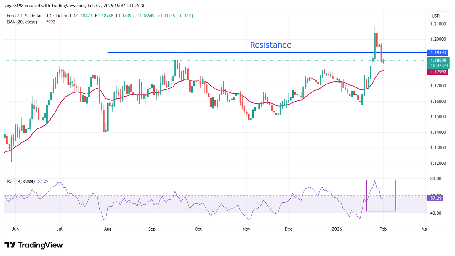 El EUR/USD cotiza ligeramente al alza cerca de 1.1865 en el momento de la publicación. El par de divisas principal se mantiene por encima de la Media Móvil Exponencial (EMA) de 20 días, lo que significa que la tendencia alcista sigue intacta.