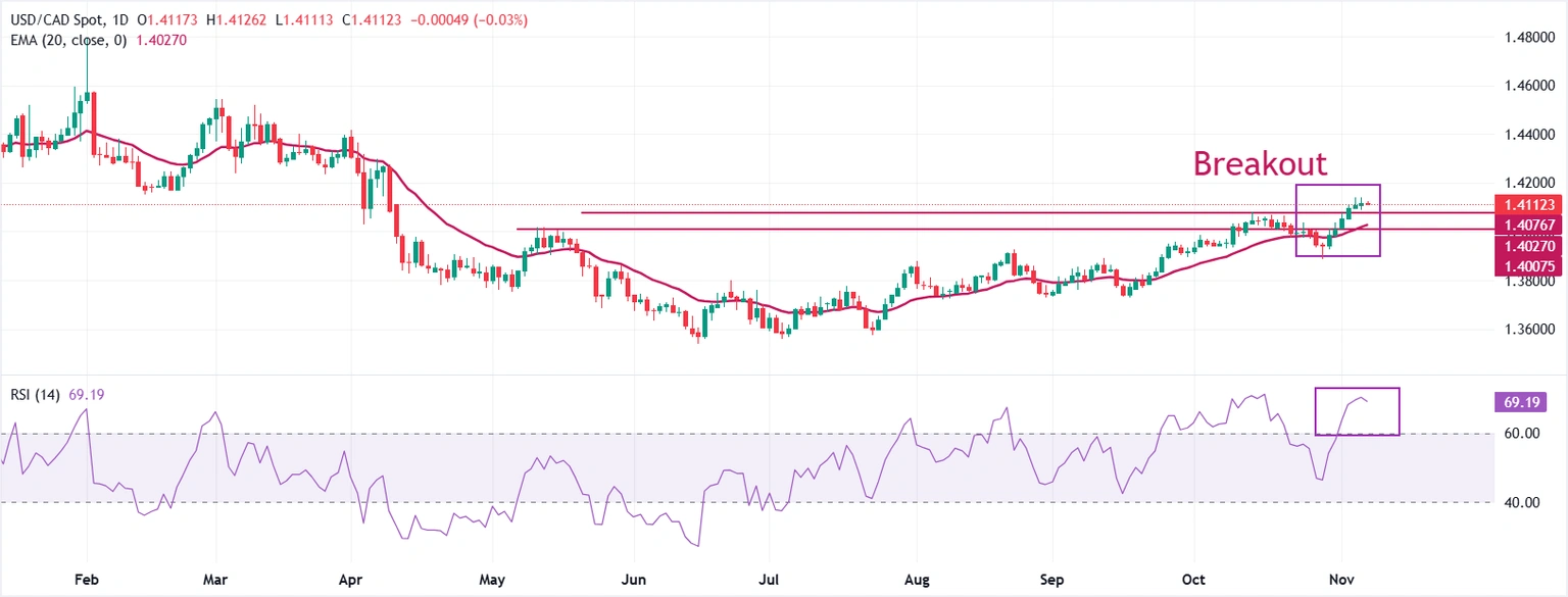El par USD/CAD cotiza en un rango estrecho alrededor de 1.4100 antes de la publicación de los datos del mercado laboral canadiense. En términos generales, el par es alcista ya que mantiene la ruptura de la zona de resistencia anterior situada en un rango entre 1.4016-1.4080.