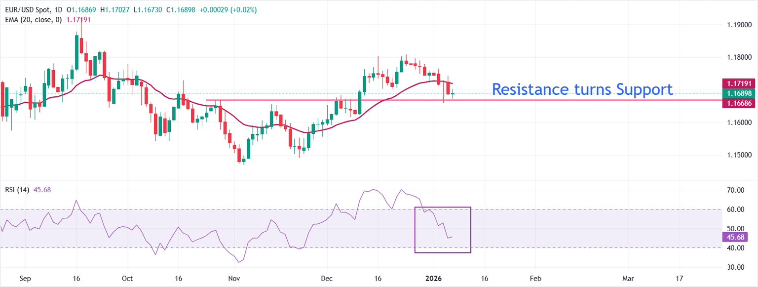 El EUR/USD cotiza plano en 1.1690 al momento de escribir. El par se sitúa por debajo de la media móvil exponencial (EMA) de 20 días en 1.1719, que ha comenzado a girar a la baja y limita los rebotes.