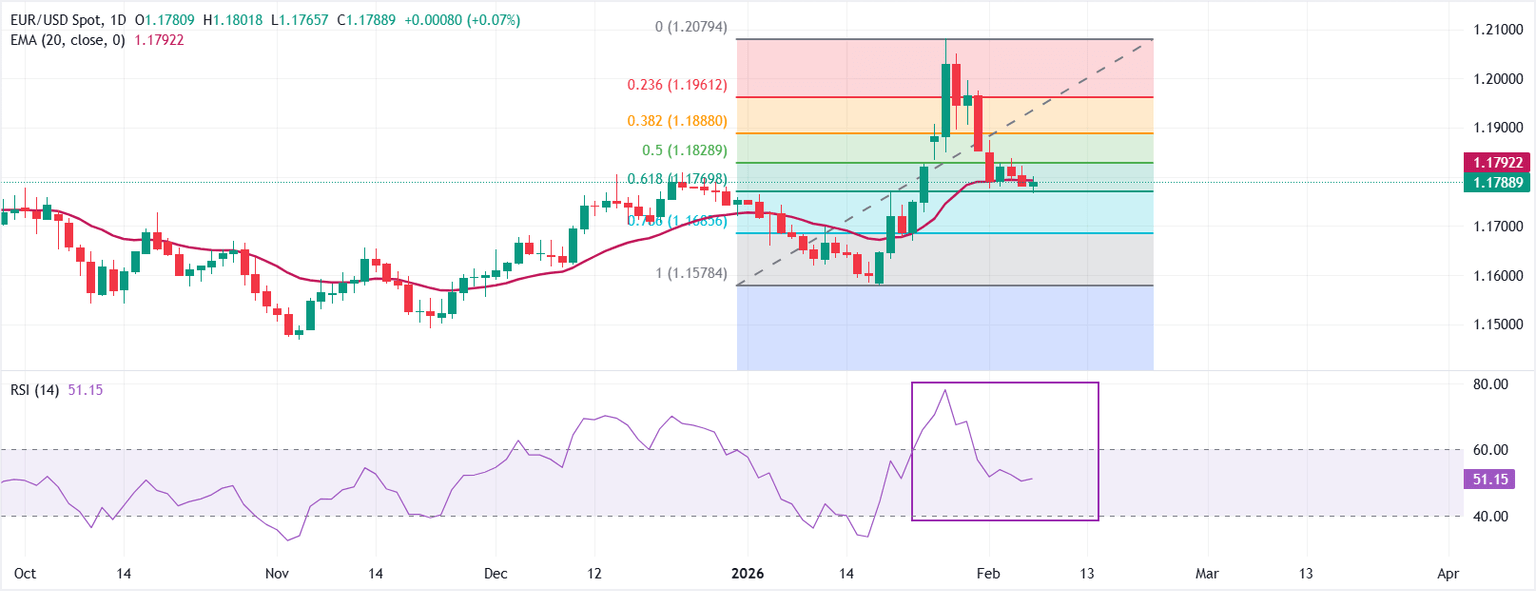 El EUR/USD cotiza al alza alrededor de 1.1789 en el momento de la publicación. La media móvil exponencial (EMA) de 20 días se sitúa en 1.1792, con el precio spot manteniéndose justo por debajo y limitando los intentos iniciales de recuperación. Un cierre decisivo por encima de la EMA de 20 días fortalecería la oferta a corto plazo.