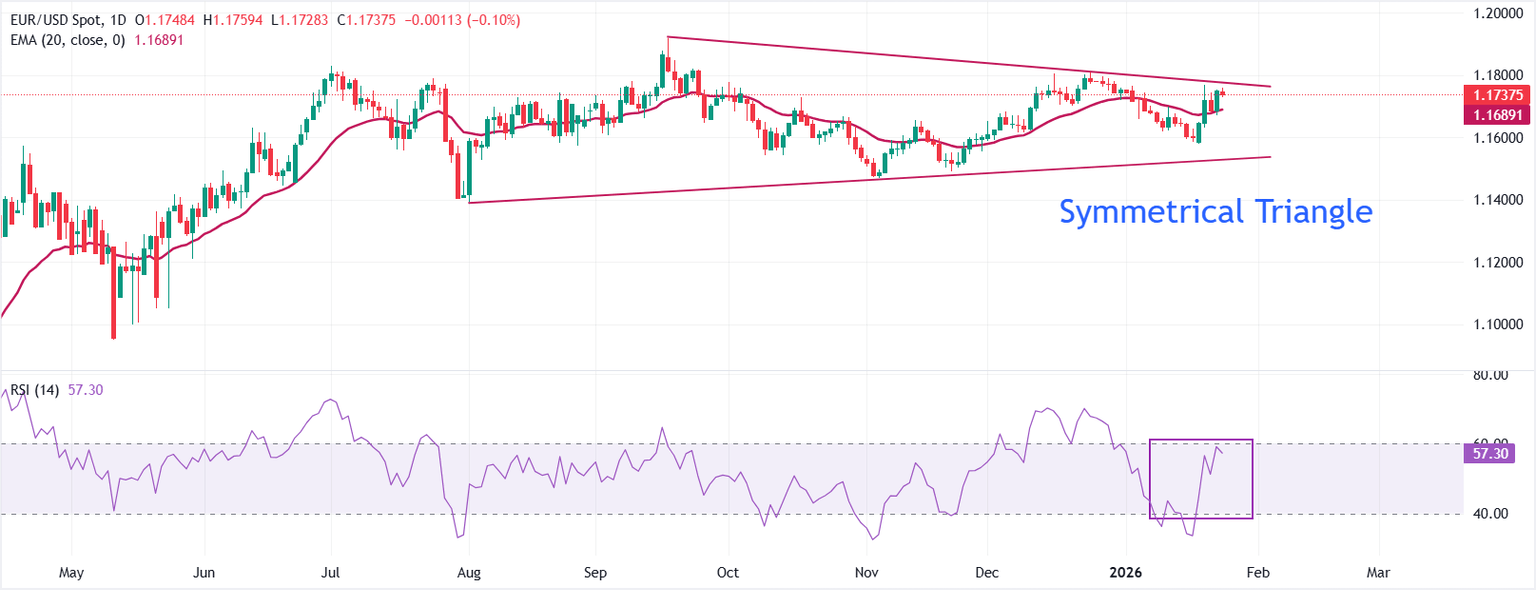 El EUR/USD cotiza de manera moderada cerca de 1.1738 en el momento de escribir. El par de divisas principal se encuentra dentro de un triángulo simétrico en el gráfico diario, lo que indica una contracción de volatilidad más amplia. El precio está cerca del límite superior del patrón de contracción de volatilidad alrededor de 1.1770, que se traza desde el máximo de varios años de 1.1919 registrado el 17 de septiembre.