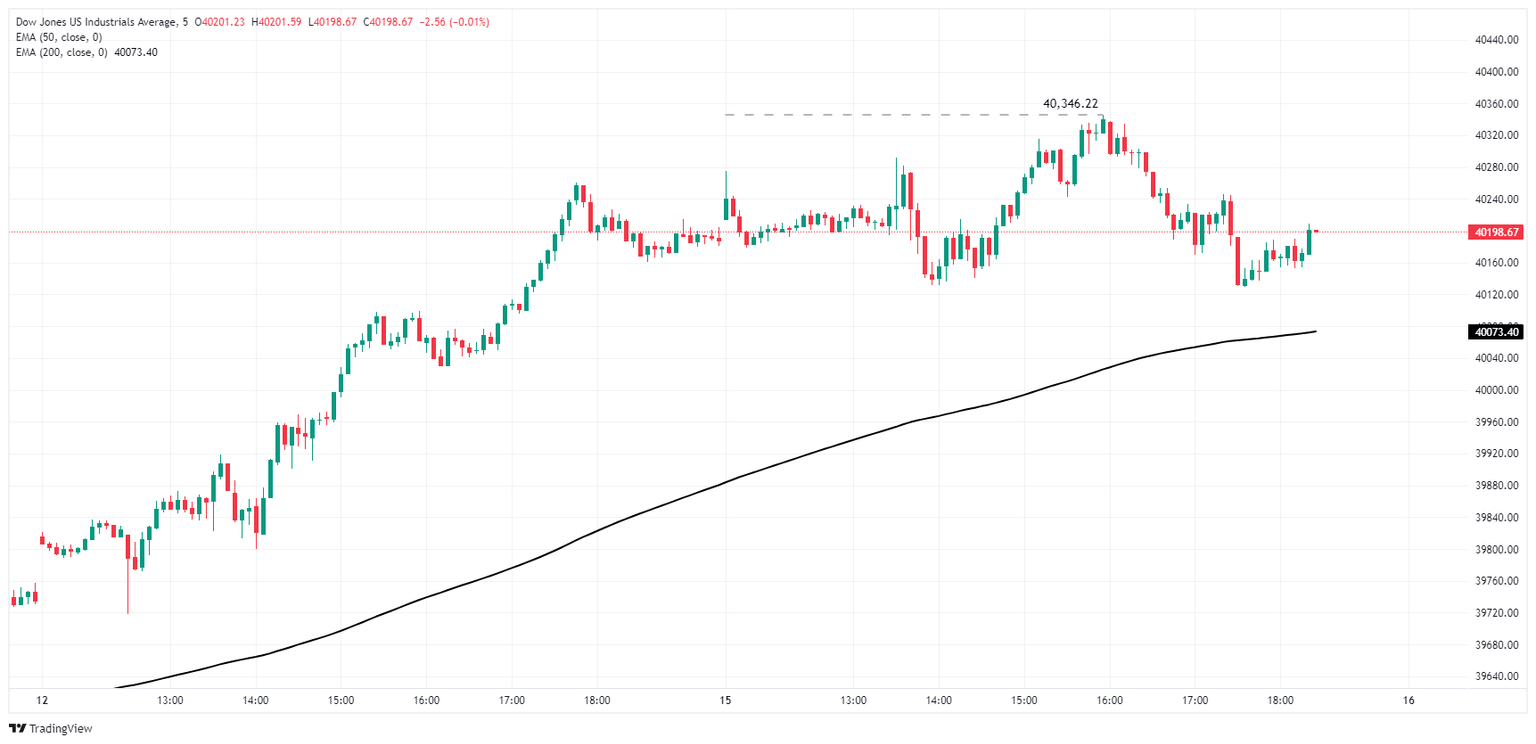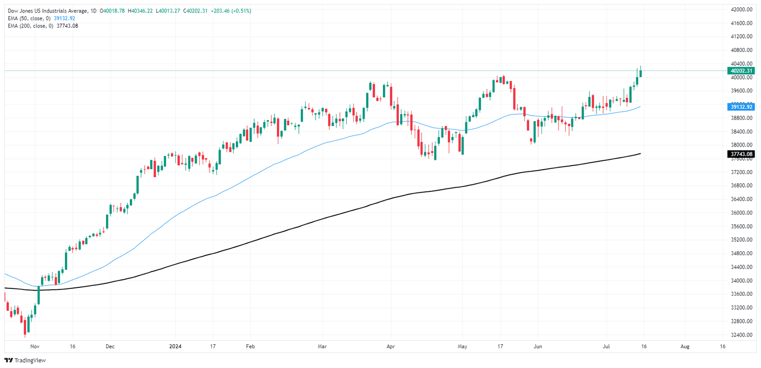 El Dow Jones se mantiene cerca de la zona de 40.200,00 el lunes después de establecer un nuevo máximo histórico, y los postores están tratando de mantener la acción del precio por encima de la zona de 40.000,00. Las velas japonesas diarias continúan manteniéndose en el lado alto de la media móvil exponencial (EMA) de 200 días, que sube hacia 38.000,00.