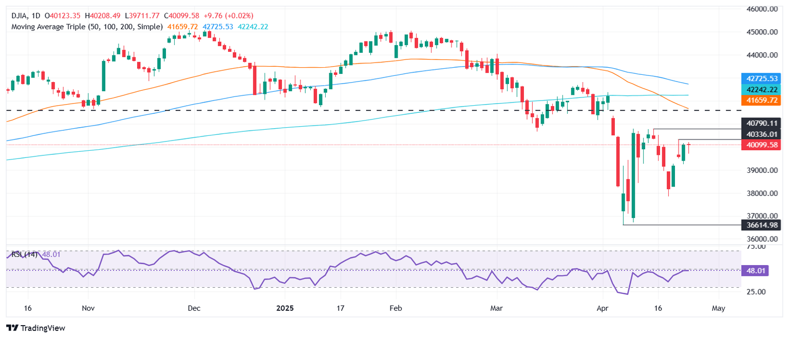 El sesgo bajista del Dow no ha cambiado a pesar de que el índice está listo para terminar la semana con ganancias de más del 2% por encima de la marca de 40.000. El Índice de Fuerza Relativa (RSI) muestra que el momentum se mantiene neutral, una indicación de que los compradores están luchando por impulsar el DJIA más alto, aunque el sentimiento ha mejorado.