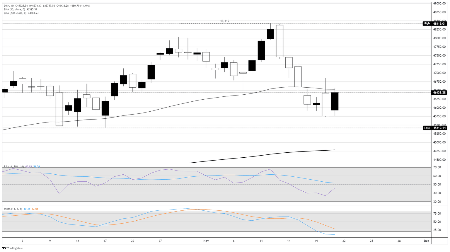 A pesar de una sesión optimista el viernes, el Dow sigue en números rojos para la semana, cayendo un 1.33% desde el cierre de la semana anterior y atrapado en territorio técnico defensivo cerca de la zona de 46.000. El índice bursátil principal ha cerrado en territorio bajista en todos menos uno de los últimos seis días de trading consecutivos, y el repunte del viernes está empujando al Dow a una zona técnica complicada que incluye antiguas zonas de soporte que pueden actuar como resistencia en el futuro, así como medias móviles clave, que podrían convertirse en techos de acción del precio.