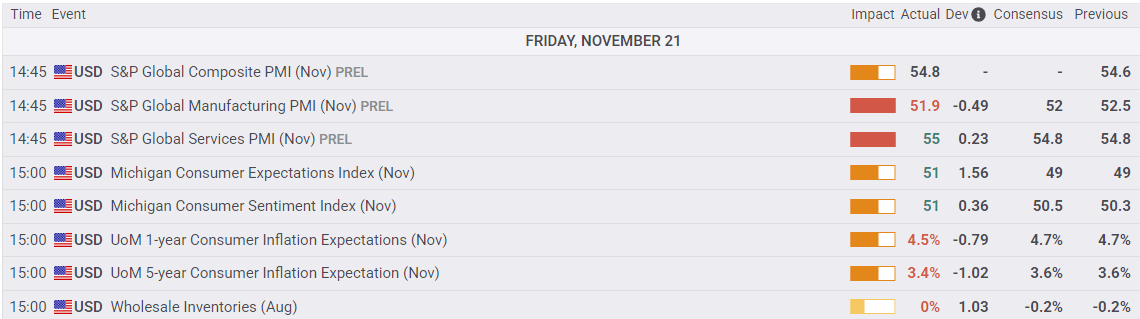 Los resultados de la encuesta de sentimiento del consumidor de la Universidad de Michigan (UoM) también llegaron mejor de lo esperado, fortaleciendo aún más el sentimiento de los inversores para cerrar una semana abrumadoramente temerosa en los mercados. Los índices de Sentimiento y Expectativas del Consumidor de la UoM aumentaron más de lo esperado para noviembre, y las Expectativas de Inflación del Consumidor a 1 año y 5 años también disminuyeron.