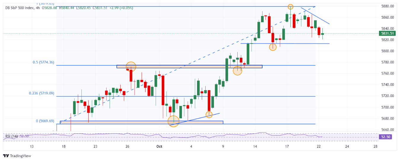 El S&P 500 reaccionó a la baja desde una resistencia de corto plazo, dada por el máximo histórico alcanzado el 17 de octubre en 5.879. A la baja observamos el primer soporte en 5.804, mínimo del 15 de octubre. El siguiente nivel clave se encuentra en 5.764, punto pivote del 10 de octubre, En sintonía con el retroceso del 50% de Fibonacci.