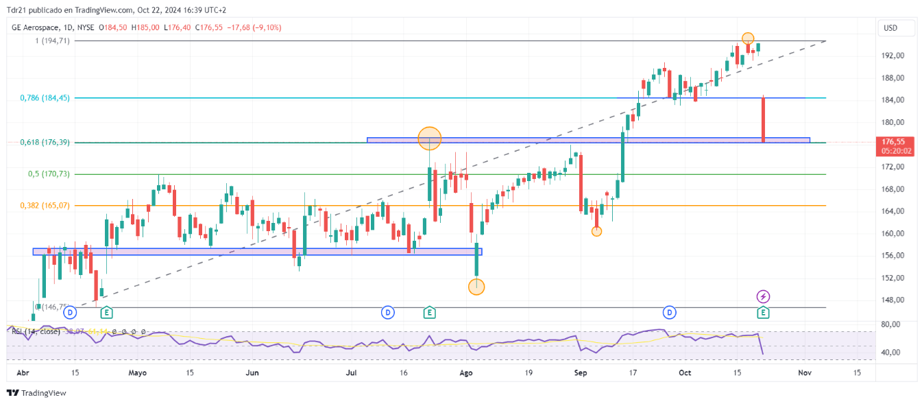 GE Aerospace (GE) obtuvo ingresos por 8.94 mil millones de dólares, por debajo de los 9.05 mil millones de dólares, decepcionando a los inversores que de inmediato han vendido su acción, llevándola a niveles no vistos desde el 16 de septiembre.