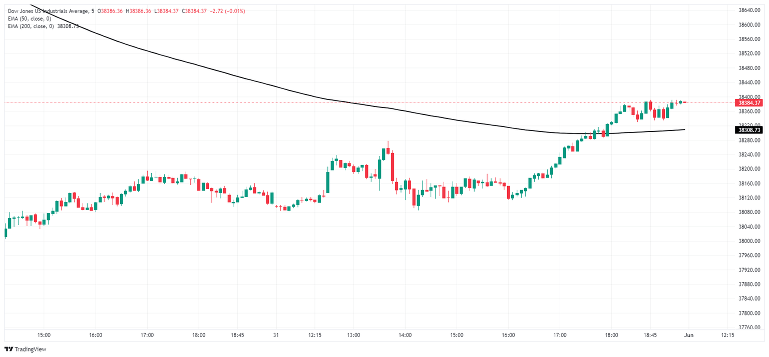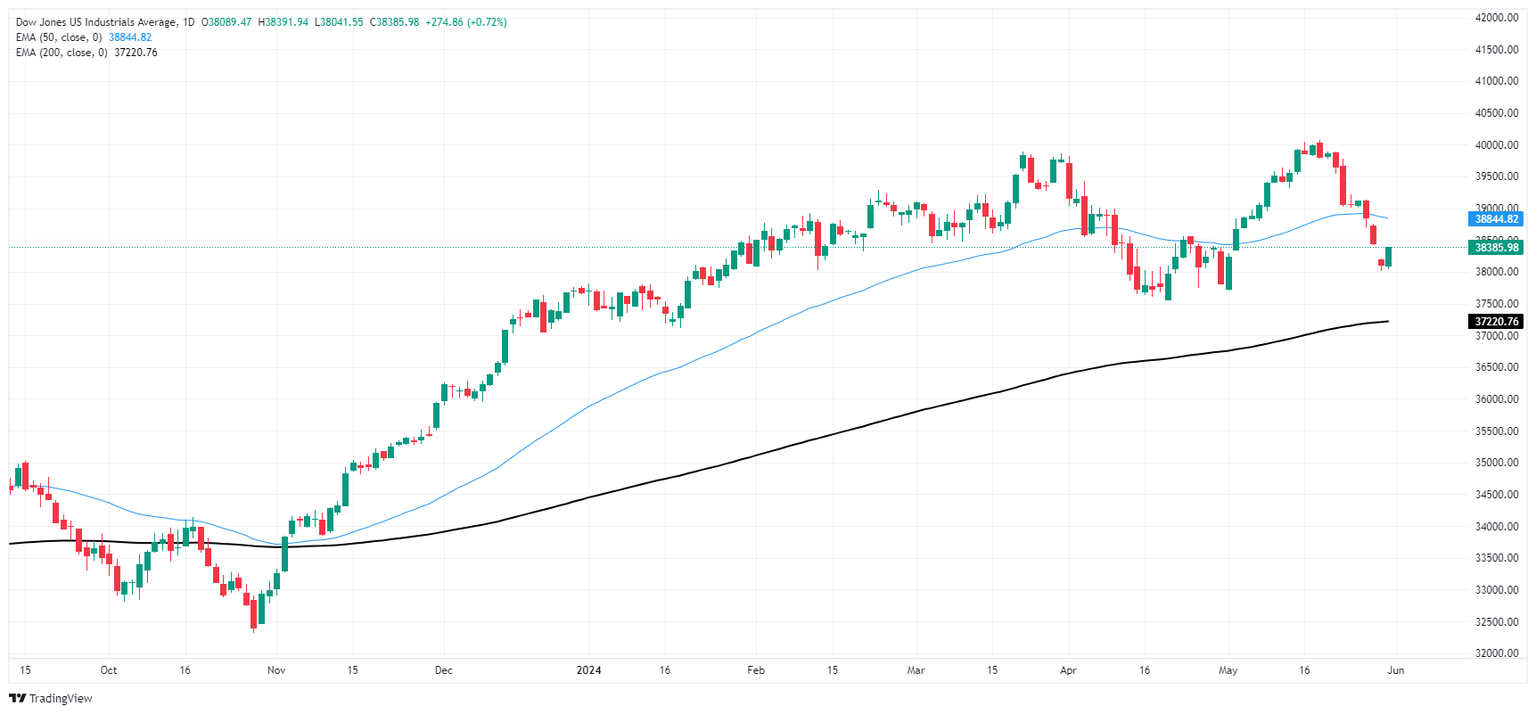El Dow Jones está rebotando desde fuertes caídas a corto plazo, probando los 38,380.00 después de alcanzar un nuevo mínimo de mayo cerca de 38,000.00 esta semana. El principal índice de acciones ha caído en todos menos tres de los últimos diez días consecutivos de negociación, y el DJIA sigue bajando un -4.2% desde los máximos históricos establecidos justo por encima de 40.000,00 el 20 de mayo.