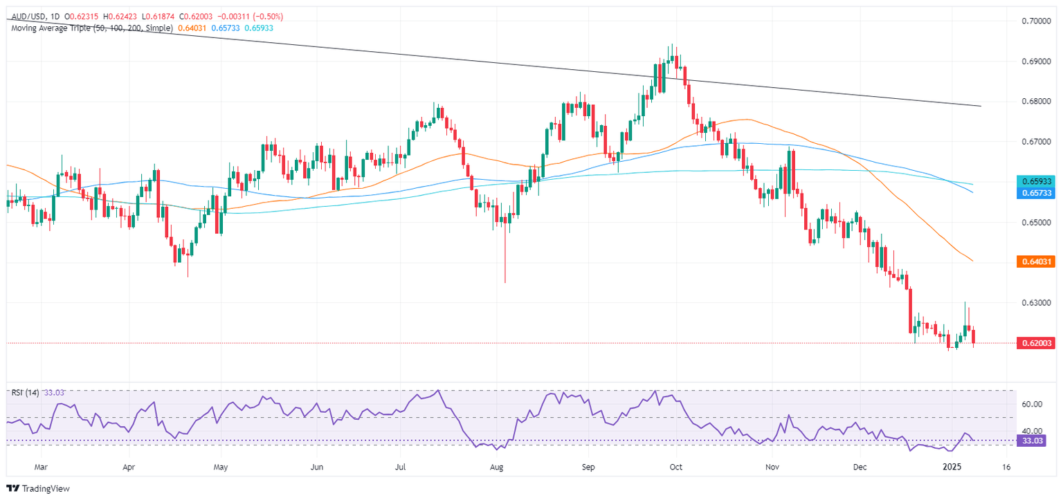 El Dólar australiano registró pérdidas de más del 0.40% frente al Dólar estadounidense, y este último sigue respaldado por las amenazas arancelarias del presidente electo de EE.UU., Donald Trump. Al momento de escribir, el AUD/USD cotiza en 0.6204 después de rebotar desde los mínimos diarios de 0.6187.