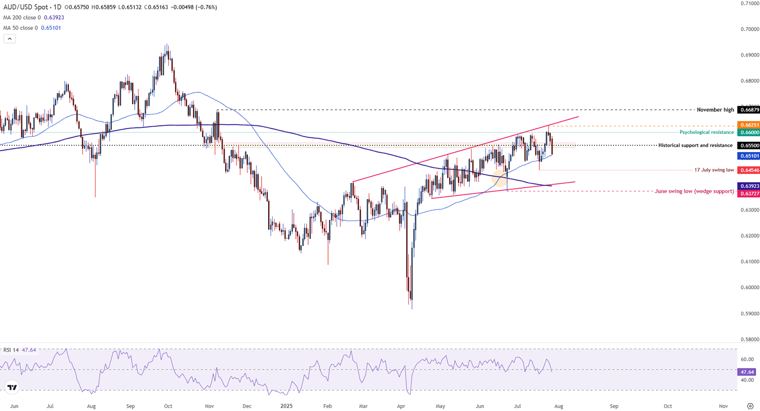 El AUD/USD rechazó la resistencia de la cuña en 0.6625, formando una larga mecha superior antes de deslizarse de nuevo por debajo del nivel psicológico de 0.6600. El par ahora está probando el soporte en 0.6550, con objetivos a la baja adicionales en la SMA de 50 días (0.6508) y el mínimo de julio (0.6454).
