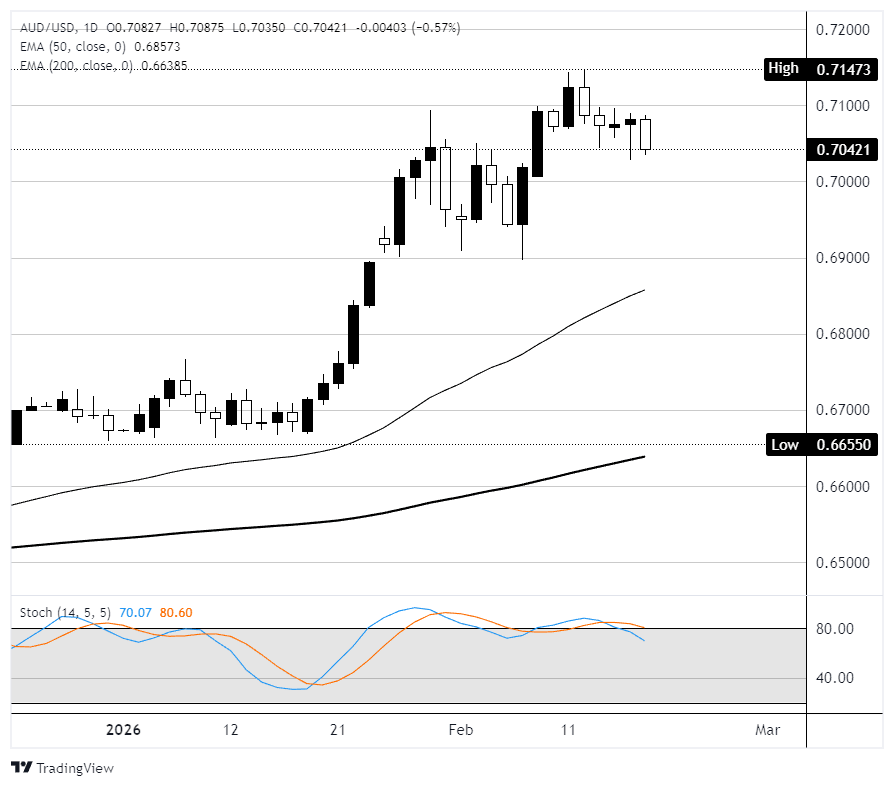 En el gráfico diario, el AUD/USD se deslizó a la baja el miércoles, cerrando cerca de 0.7040 y perdiendo un 0.56% en una sesión confinada a un rango estrecho. El par continúa manteniéndose bien por encima de la media móvil exponencial (EMA) de 50 días en 0.6860 y la EMA de 200 días en 0.6640, manteniendo el impulso alcista general de la recuperación de finales de diciembre desde 0.6600 firmemente en su lugar. El Oscilador Estocástico ha cruzado a la baja desde la zona de sobrecompra, sugiriendo que el impulso a corto plazo se está desvaneciendo, y el par puede consolidarse más antes de su próximo movimiento direccional. Las velas recientes muestran una serie de sesiones de cuerpo pequeño cerca del área de 0.7050, apuntando a la indecisión antes de la publicación del empleo del jueves. El soporte inmediato se sitúa en 0.7000, con resistencia en el máximo del año hasta la fecha de 0.7147; una ruptura por encima apuntaría a la zona de 0.7200.