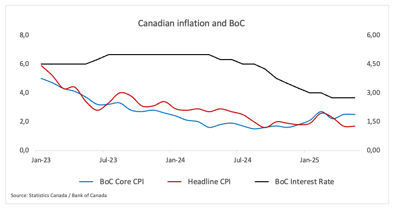 El BoC decidió mantener las tasas estables en junio, citando una economía canadiense que es "más suave pero no drásticamente más débil" y señalando "firmeza en los datos recientes de inflación". De hecho, la tasa de política se sitúa en 2.75%, que sigue dentro del rango neutral estimado por el banco para las tasas de interés, establecido entre 2.25% y 3.25%.