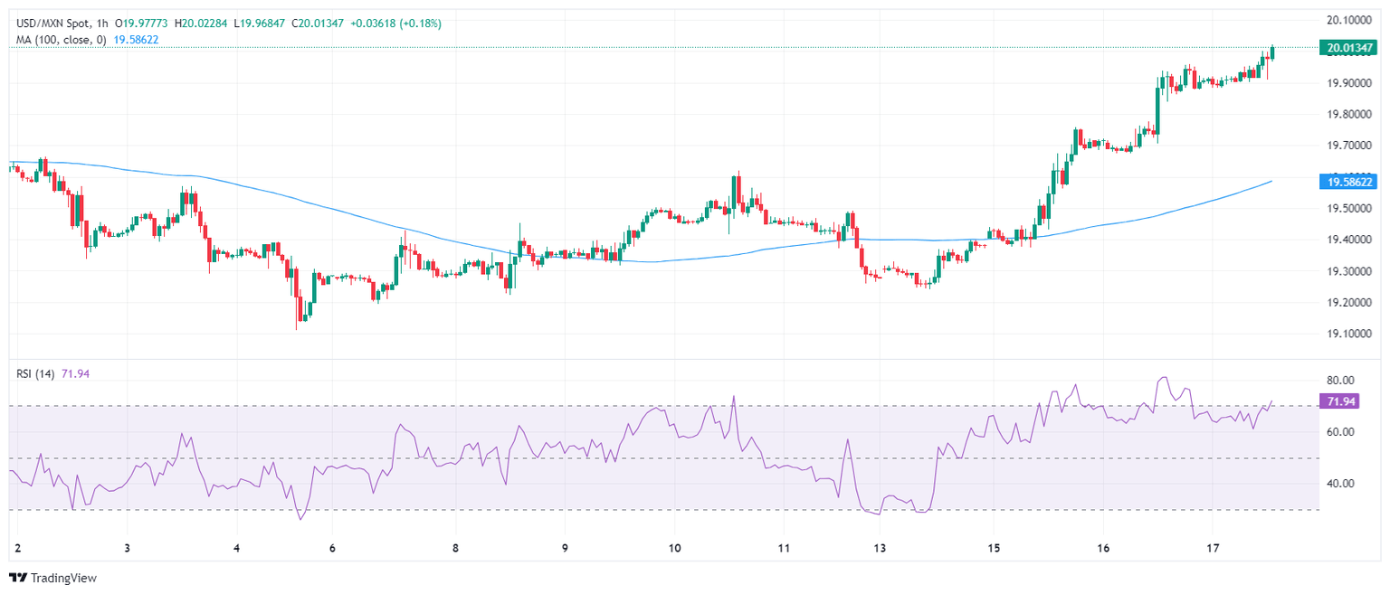 El USD/MXN ha comenzado la jornada del jueves probando un mínimo diario en 19.87. Posteriormente, el par ha ido recuperando terreno, alcanzando un máximo de cinco semanas en 20.01 antes de la apertura de Wall Street. Al momento de escribir, el Dólar estadounidense cotiza frente al Peso mexicano alrededor de 19.97, ganando un 0.45% en el día.