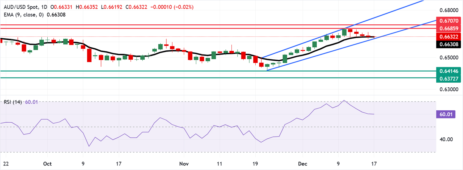 El par AUD/USD se cotiza alrededor de 0.6630 el miércoles. El análisis técnico del gráfico diario muestra que el par se mueve dentro de una tendencia de canal ascendente, reflejando un sesgo alcista. Sin embargo, el par se mantiene alrededor de la Media Móvil Exponencial (EMA) de nueve días, lo que indica un impulso de precios neutral a corto plazo.