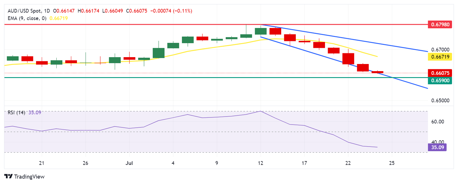 El Dólar australiano cotiza alrededor de 0.6610 el miércoles. El análisis del gráfico diario muestra que el par AUD/USD se está depreciando dentro de un canal descendente, lo que indica un sesgo bajista. El Índice de Fuerza Relativa (RSI) de 14 días está por debajo del nivel de 50, confirmando una tendencia bajista.