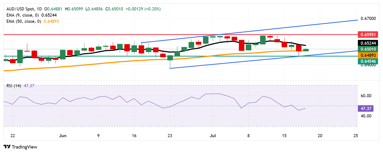 El AUD/USD está cotizando alrededor de 0.6510 el viernes. El análisis técnico del gráfico diario indica que un sesgo alcista está activo ya que el par se encuentra posicionado dentro del patrón de canal ascendente. Sin embargo, el Índice de Fuerza Relativa (RSI) de 14 días se posiciona por debajo del nivel 50, sugiriendo que el sesgo del mercado se está debilitando. El par permanece por debajo de la media móvil exponencial (EMA) de nueve días, lo que indica que el impulso del precio a corto plazo se está debilitando.