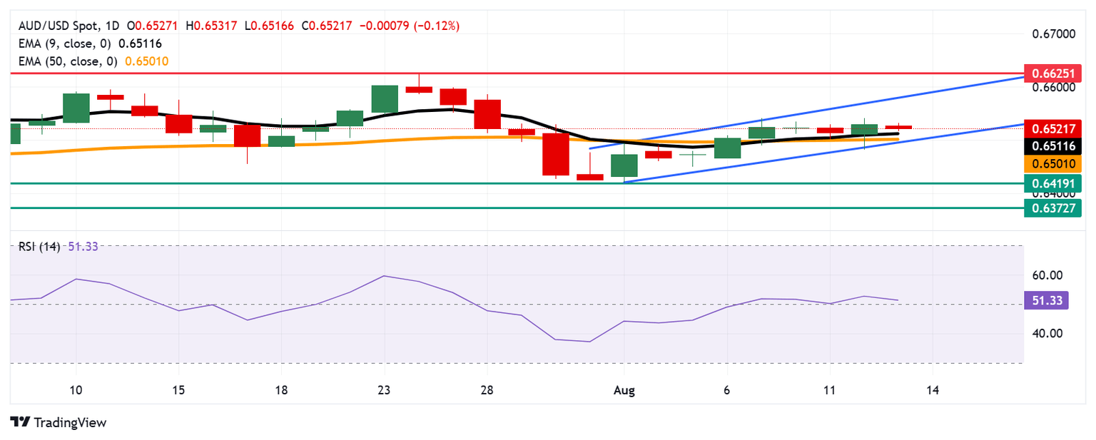 El AUD/USD se está negociando alrededor de 0.6520 el miércoles. El análisis técnico en el gráfico diario sugiere un sesgo alcista predominante ya que el par permanece dentro del patrón de canal ascendente. Además, el par sigue por encima de la media móvil exponencial (EMA) de nueve días, señalando que el impulso a corto plazo se está fortaleciendo. El Índice de Fuerza Relativa (RSI) de 14 días se posiciona en el nivel 50, sugiriendo un sesgo de mercado neutral. Un movimiento adicional indicará una tendencia direccional clara.