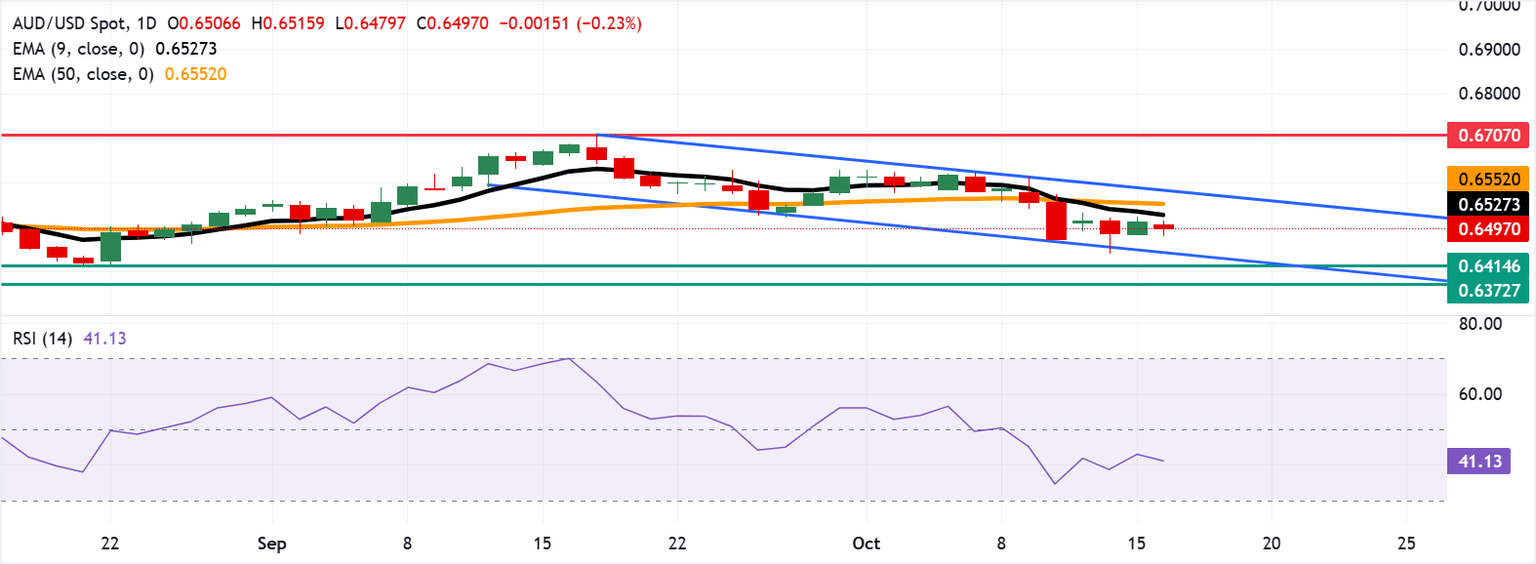 El par AUD/USD se está negociando alrededor de 0.6500 el jueves. El análisis técnico en el gráfico diario sugiere un sesgo bajista en curso, ya que el par se mantiene dentro de un patrón de canal descendente. Además, el Índice de Fuerza Relativa (RSI) de 14 días sigue posicionado por debajo del nivel 50, fortaleciendo el sesgo bajista.