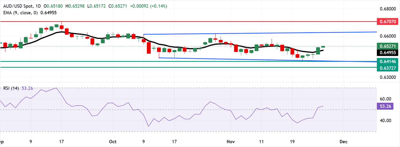 El par AUD/USD se está negociando alrededor de 0.6530 el jueves. El análisis del gráfico diario muestra que el par se mantiene dentro de una zona de consolidación rectangular, señalando un sesgo neutral. El par ha superado la media móvil exponencial (EMA) de nueve días, destacando que el impulso alcista a corto plazo se ha vuelto más fuerte.