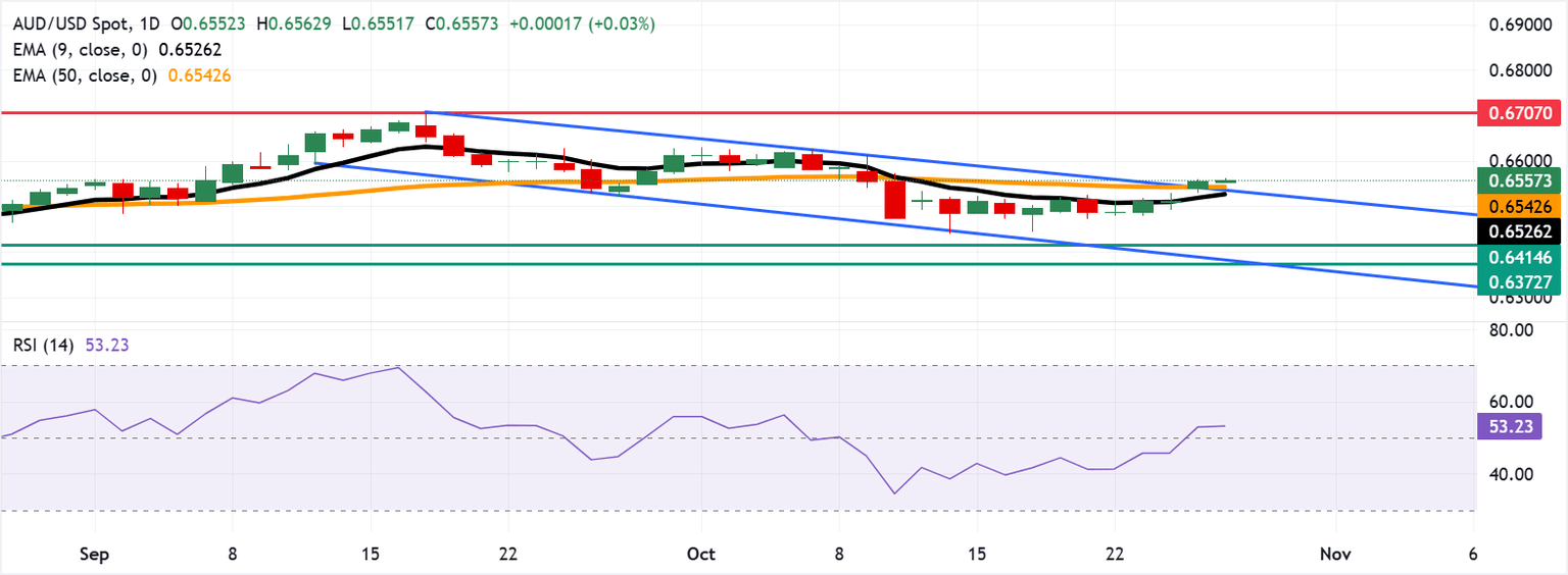 El AUD/USD se está negociando alrededor de 0.6560 el martes. Un análisis técnico de un gráfico diario sugiere una reversión alcista, ya que el par está posicionado ligeramente por encima del límite superior del canal descendente. El par también se está negociando por encima de las medias móviles exponenciales (EMA) de nueve y 50 días, lo que indica que tanto el impulso de precios a corto como a medio plazo sigue siendo fuerte.