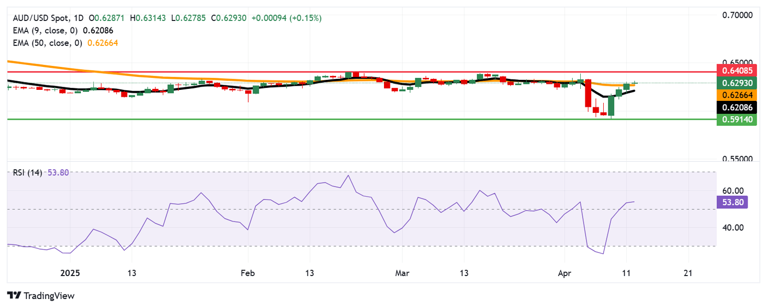 El par AUD/USD se encuentra rondando el nivel de 0.6300 el lunes. Los indicadores técnicos en el gráfico diario sugieren un leve sesgo alcista, con el par negociándose por encima de las medias móviles exponenciales (EMA) de nueve y 50 días. El Índice de Fuerza Relativa (RSI) de 14 días también ha subido por encima del umbral de 50, apoyando aún más la perspectiva alcista.