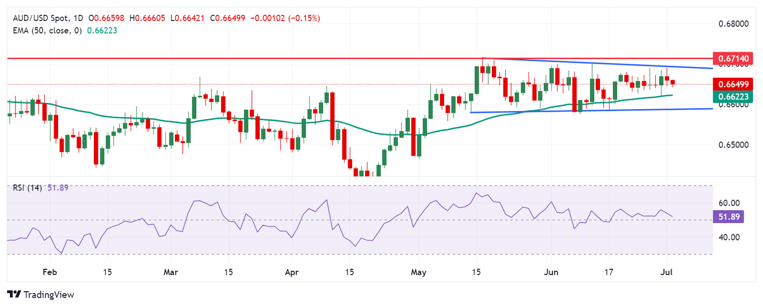 El Dólar australiano opera alrededor de 0.6640 el martes. El análisis del gráfico diario muestra un sesgo neutral para el par AUD/USD, que se está consolidando dentro de una formación de rectángulo. El Índice de Fuerza Relativa (RSI) de 14 días está en 50, lo que también indica un momentum neutral. Los movimientos futuros pueden proporcionar una tendencia direccional más clara.