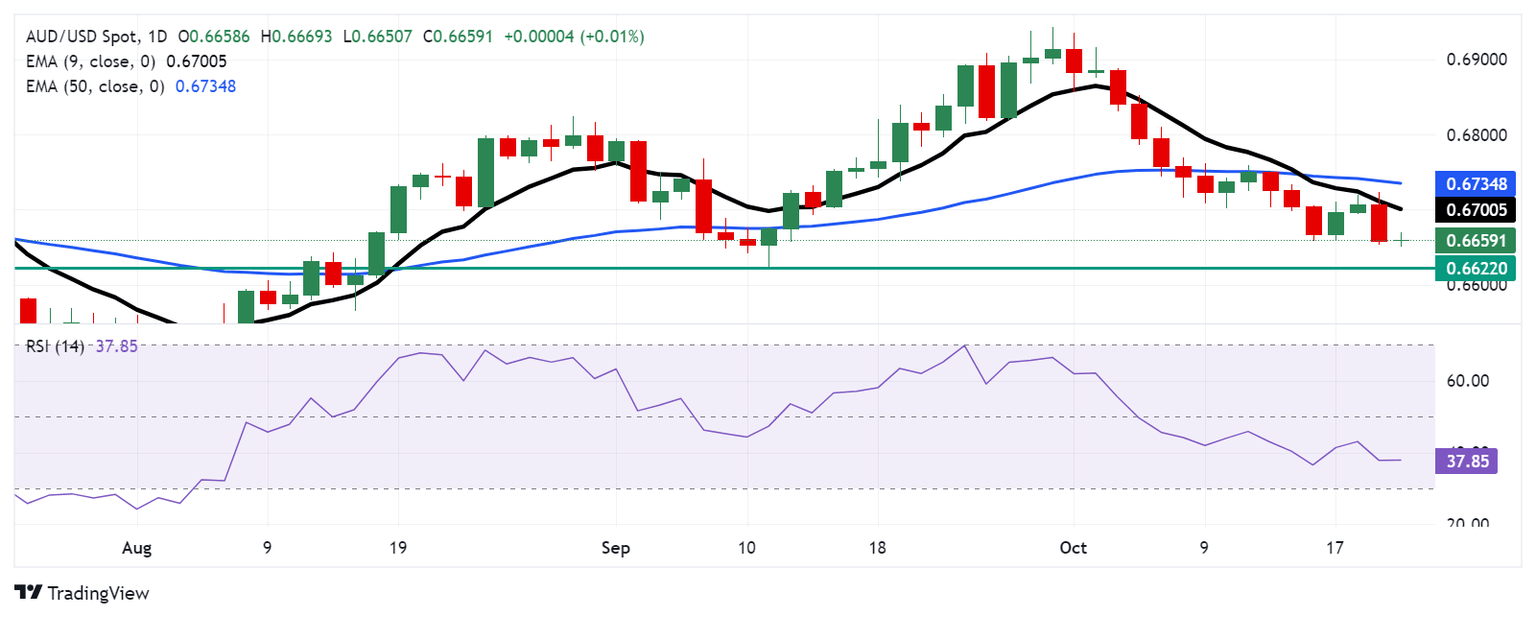 El par AUD/USD cotiza alrededor de 0.6660 el martes. El análisis técnico del gráfico diario muestra al par por debajo de la media móvil exponencial (EMA) de nueve días, lo que indica una perspectiva bajista a corto plazo. Además, el Índice de Fuerza Relativa (RSI) de 14 días se mantiene por debajo de 50, reforzando el sentimiento bajista.