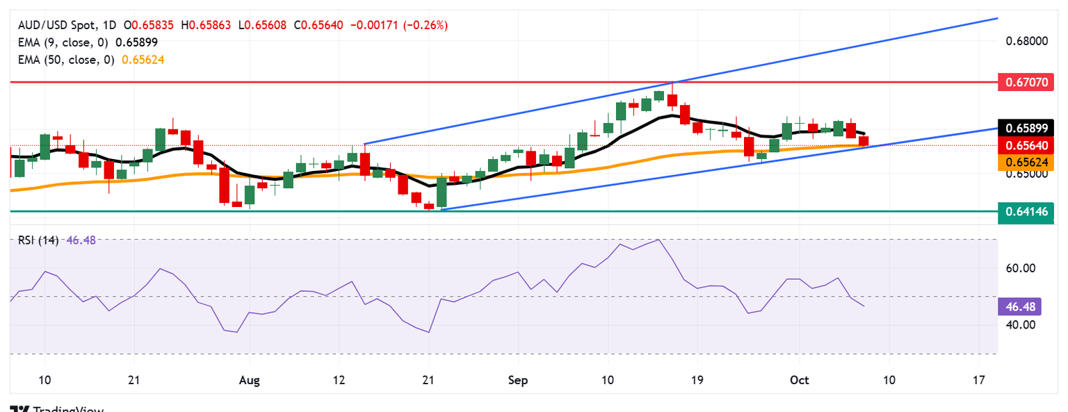 El par AUD/USD se está negociando alrededor de 0.6570 el miércoles. El análisis técnico en el marco de tiempo diario sugiere que el par se mantiene dentro del canal ascendente, indicando un sesgo alcista persistente. Además, el Índice de Fuerza Relativa (RSI) de 14 días está posicionado por encima del nivel 50, fortaleciendo el sesgo alcista.