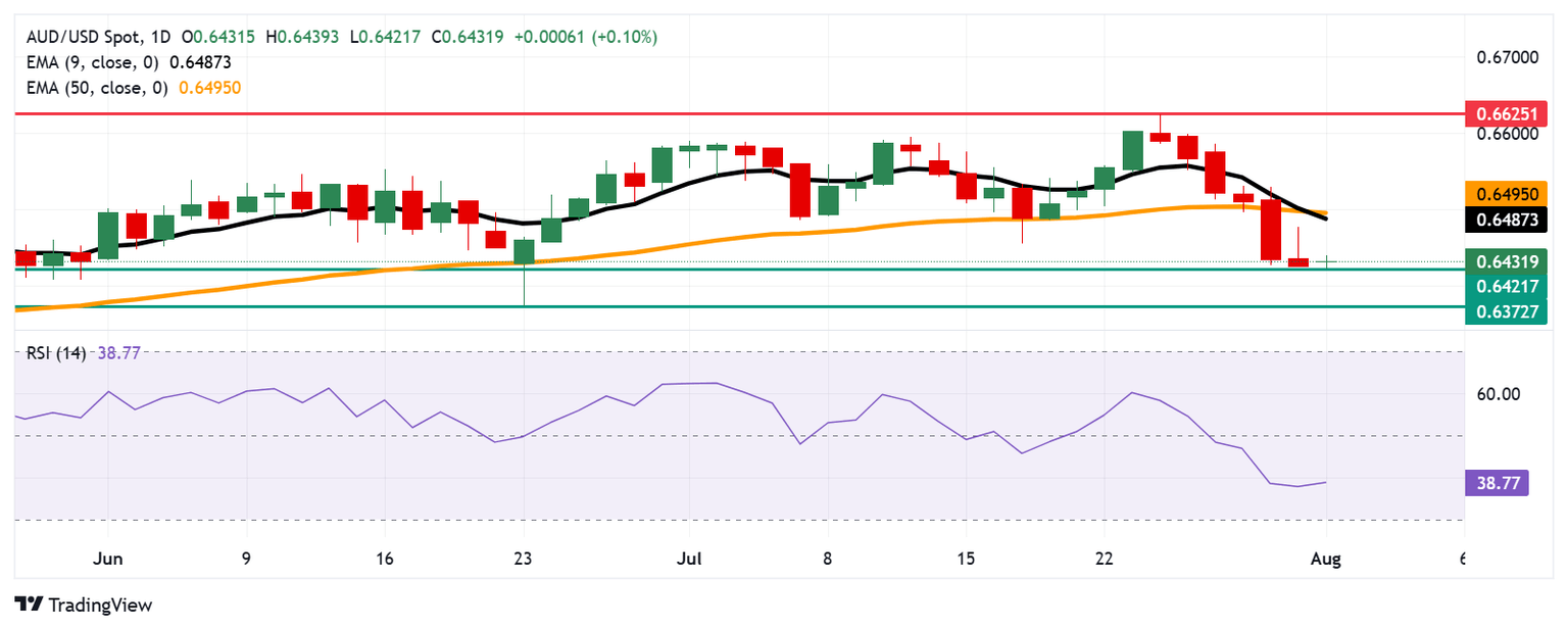 El AUD/USD se cotiza alrededor de 0.6430 el viernes. El análisis técnico del gráfico diario indica un sesgo bajista ya que el Índice de Fuerza Relativa (RSI) de 14 días se mantiene por debajo de la marca de 50. Además, el par está posicionado por debajo de la media móvil exponencial (EMA) de nueve días, lo que indica que el impulso del precio a corto plazo es más débil.
