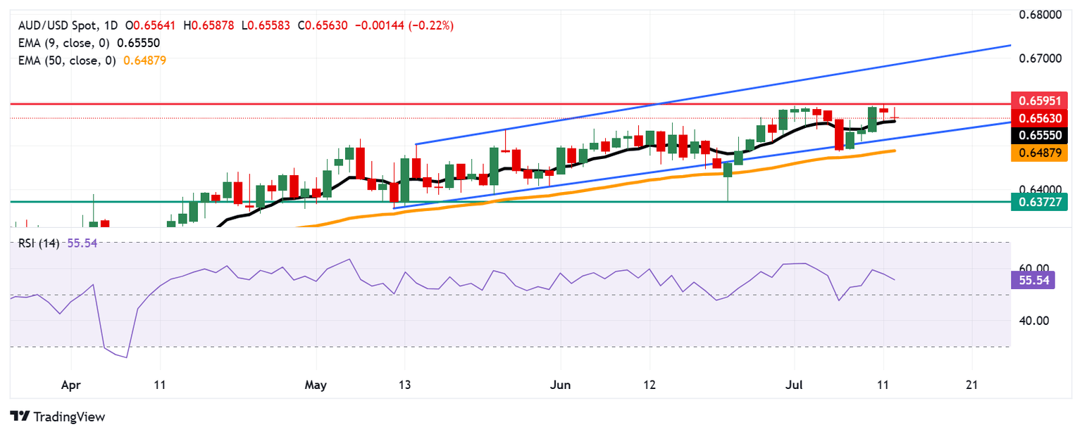 El par AUD/USD está probando su soporte inicial en la EMA de nueve días de 0.6555. Una ruptura exitosa por debajo de este nivel debilitaría el sentimiento del mercado y ejercería presión a la baja sobre el par para probar el límite inferior del canal ascendente alrededor de 0.6520, seguido por la EMA de 50 días en 0.6487.