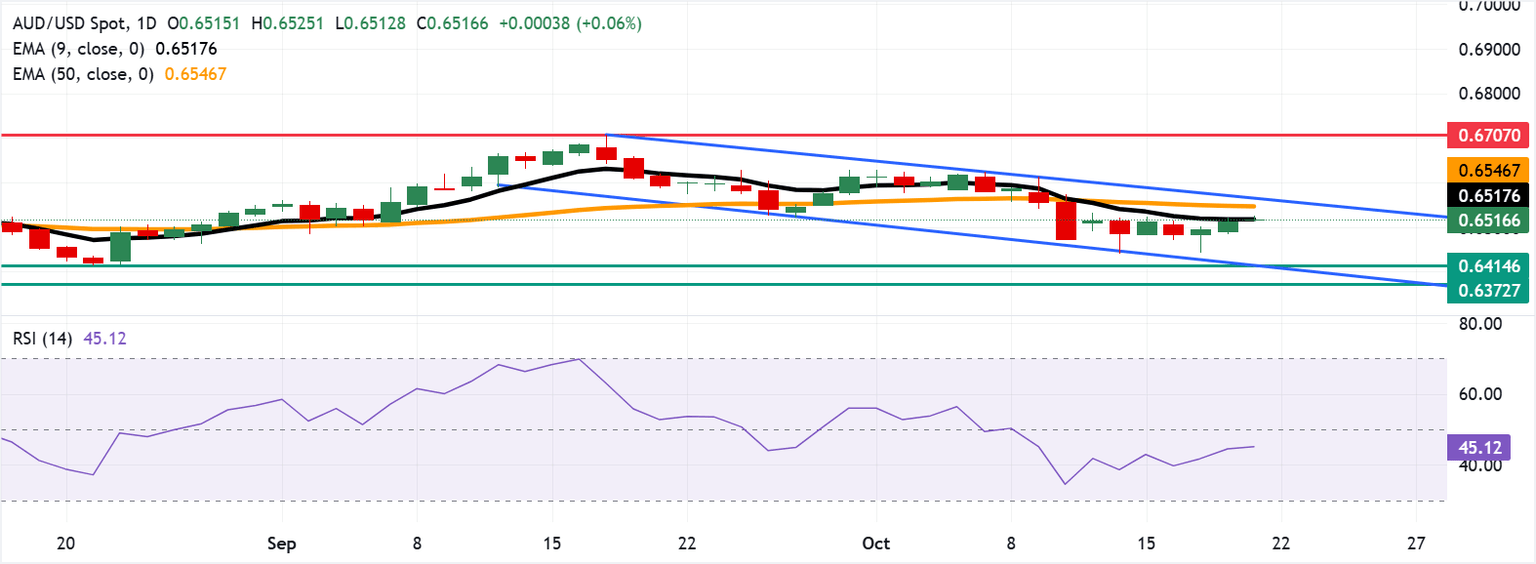 El AUD/USD se cotiza alrededor de 0.6510 el martes. Un análisis técnico de un gráfico diario sugiere un sesgo bajista persistente, con el par cotizando dentro de un canal descendente. El RSI de 14 días se mantiene por debajo de 50, fortaleciendo la perspectiva bajista.