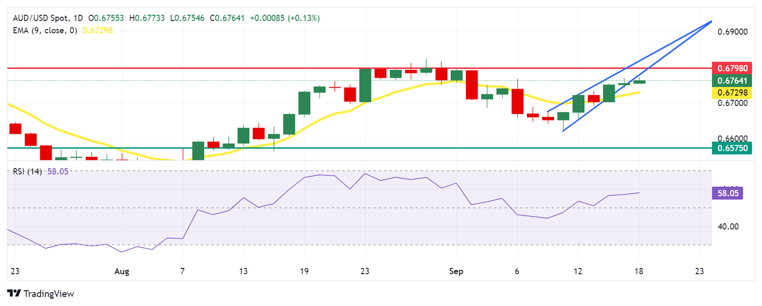 El par AUD/USD cotiza cerca de 0.6760 el miércoles. El análisis técnico del gráfico diario indica que el par está posicionado por debajo del límite inferior del patrón de cuña ascendente (más visible en el marco temporal inferior), lo que indica una posible reversión bajista. Sin embargo, el Índice de Fuerza Relativa (RSI) de 14 días se mantiene por encima del nivel de 50, lo que sugiere una tendencia alcista en curso.